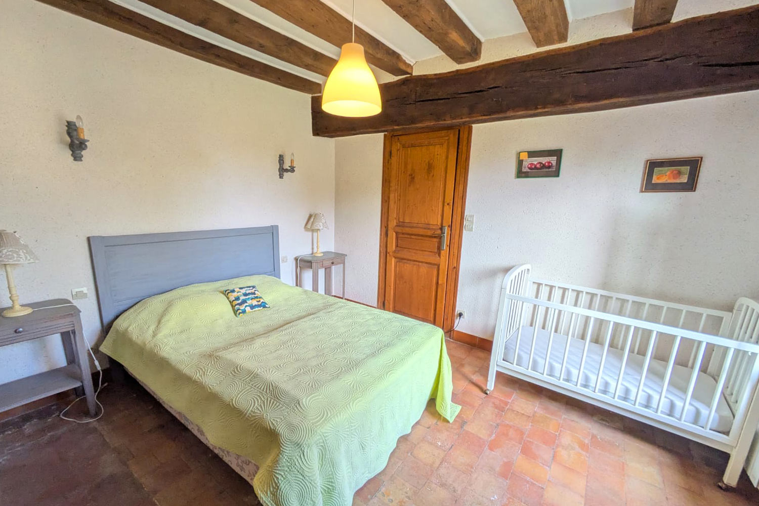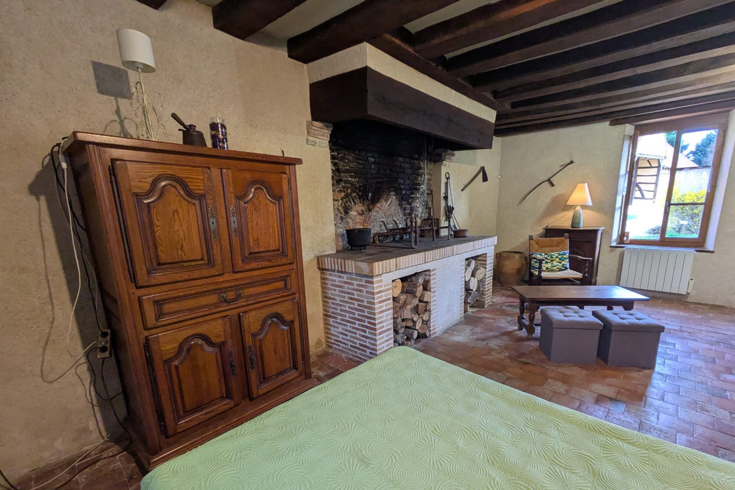 À l’intérieur, les tommettes anciennes, les murs à colombages et la grande cheminée surélevée donnent tout son caractère à cette maison et offrent une immersion immédiate dans l’ambiance chaleureuse d’un séjour en Sologne.
